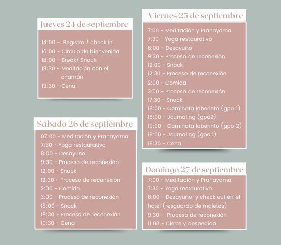 Este retiro de 4 días y 3 noches es una inmersión profunda diseñada para que vuelvas a ti: para sanar, liberar y desprogramar aquello que ya no necesitas, mientras creas el espacio interno que te permitirá reconectar con tu propósito y manifestar los sueños de tu corazón.